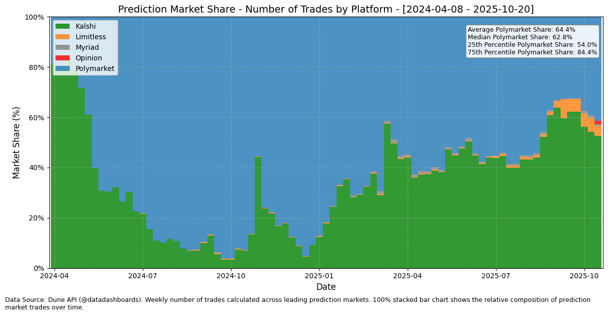 Granted, it’s not a foregone conclusion that Polymarket will be the dominant prediction market platform. While it currently dominates both (i) notional trading volume on prediction markets and (ii) the number of bets / trades placed on prediction markets (as seen above), it may be the case that a novel upstart like Limitless starts to capture more volume on long-tail markets. Or maybe, Kalshi becomes the clearinghouse (basically the backend orderbook where trades are routed to) for not only Robinhood but other legacy financial institutions before Polymarket can, and given it’s a network-effects business, users and liquidity matter more than anything else. One thing is for certain — marketplaces for almost everything are power law distributed — a few winners will take most of the market share. And if prediction markets become as big as I think they will (and many others think they will), a large share of an even larger pie is generational wealth creation.
