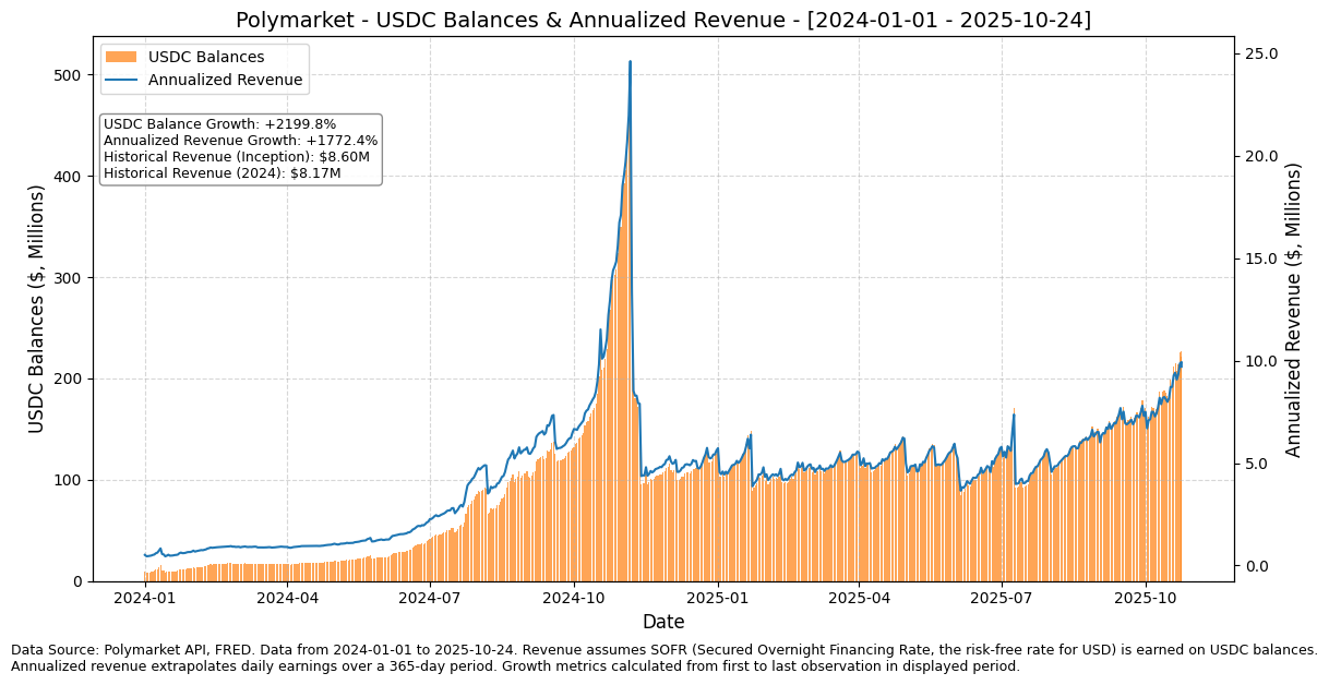 Deposits: This refers to any USDC balance held on Polymarket (it can be an idle balance or USDC used to place a limit order). Given the underlying USDC is backed mainly by Treasury Bills, it generates a ‘risk-free yield,’ currently ~4.2%. So you can imagine a world where Polymarket strikes a deal with Circle to share some of the yield that USDC on Polymarket is generating. Or, even better, Polymarket can re-denominate all USDC balances on the platform in their own native stablecoin (if they launch one), basically owning all the economics of their stablecoins and not being beholden to Circle (this would basically entail converting / redeeming all user balances from USDC to their own dollar-pegged stablecoin and sticking the underlying dollars into a yielding, short-term instrument like Treasury Bills). What would this — capturing the yield of the stablecoins on their platform — have looked like for Polymarket if they did this from the beginning? As seen below, assuming Polymarket captured 100% of the yield USDC on their platform generated, they would have only made ~$8.6M (~$8.17M of that being from the start of 2024). This assumes the USDC was earning, give-or-take, the prevailing SOFR (secured overnight financing rate — basically the risk-free rate for U.S. dollars). Even with their current USDC balances sitting at north of $200M, they can really only generate a theoretical maximum of <$10M (but you’d have to factor in revenue share with Circle, and if they issued their own stablecoin, the fixed costs and ongoing variable costs, needing to have non-yielding reserves for redemption, etc.). And with the Fed embarking on a rate-cutting cycle, this is clearly not a viable way to monetize a prediction market like Polymarket at scale.