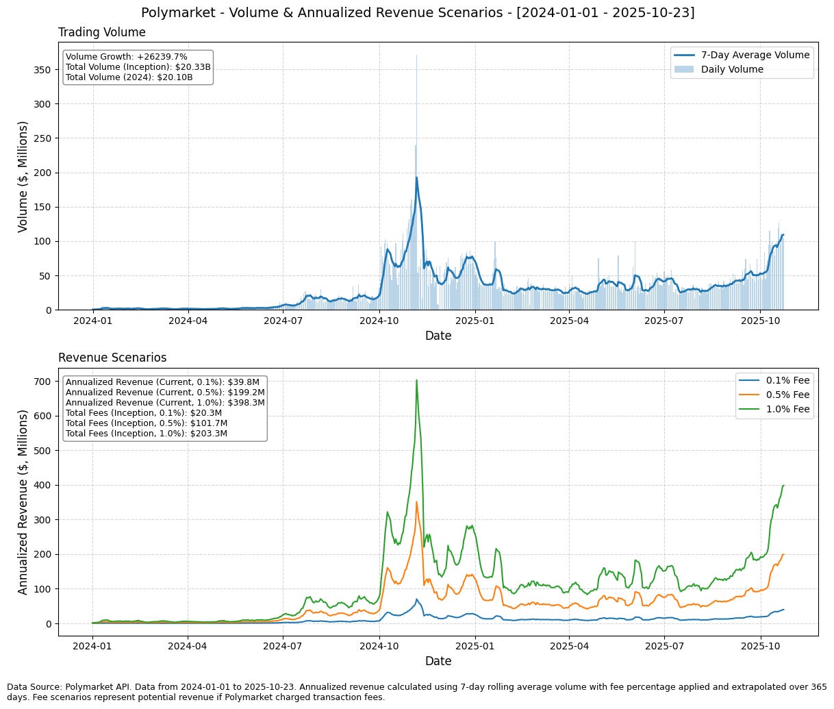 Flows: This refers to trade activity conducted on Polymarket. When a buyer / seller with a patient disposition interacts with a seller / buyer with an impatient disposition, a trade is consummated. In other words, when makers of liquidity place limit orders on Polymarket’s orderbooks and takers of liquidity come in and execute against that liquidity, trade volume materializes. What if Polymarket took a fee on trade volume, say 1%? So if a patient seller (the maker) sold $100 worth of some YES / NO event share to an aggressive buyer (the taker), the seller would receive $100 minus X (the maker fee), and the buyer would pay $100 plus Y (the taker fee) to receive the YES / NO shares. Like with most orderbooks that incentivize maker activity (as they create liquidity for markets), let’s assume the maker fee is much lower than the taker fee — say a 0.1% to 0.9% split. So 0.9% of the fee for each trade would be paid by the taker, and 0.1% by the maker, and this would all go to Polymarket for providing the marketplace for the parties to trade. Polymarket doesn’t charge any fees on trading now, but what if they did? As seen below, Polymarket generated, since inception, ~$20.33 billion of volume (~$20.10B of that since the start of 2024). Accordingly, using a 7-day rolling average volume with a fee percentage applied and extrapolated over 365 days, we can plot, under different fee scenarios, what annualized revenue would look like — under a 1bps fee scenario, 50bps fee scenario, and a 100bps fee scenario. And as seen, at the current 7-day rolling average volume, Polymarket would annualize ~$400M in revenue at a 100bps fee scenario. At 50bps, that would be ~$200M, and at 10bps, ~$40M.
